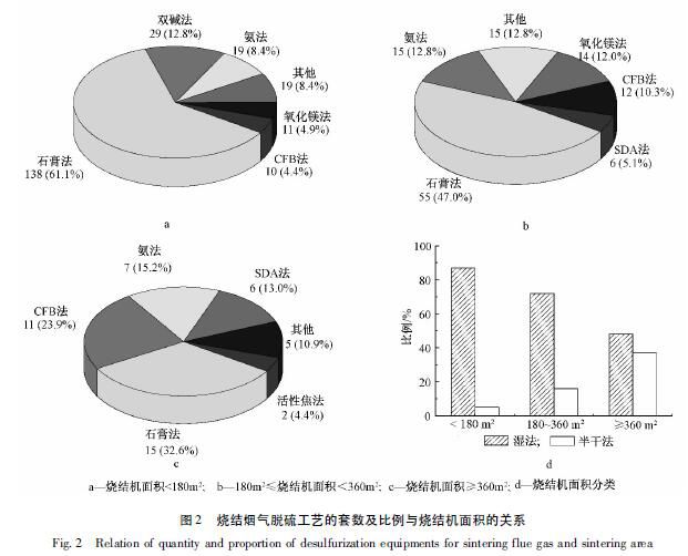 燒結機面積大于等于360m2時,共投運脫硫裝置46套。由圖2c可見:脫硫工藝應用5套以上的有石灰石-石膏法、CFB法、氨法和SDA法,占比依次為32.6%、23.9%、15.2%和13.0%;石灰石-石膏法和氨法等濕法的占比為48%,CFB法和SDA法等半干法的占比為37%。活性炭法脫硫工藝的應用有2套。