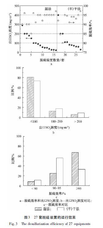 圖3b對比了濕法和(半)干法出口SO2濃度:出口SO2濃度≤180mg/m3時,濕法和(半)干法脫硫套數占比分別為81%和73%;出口180mg/m3200mg/m3時,濕法和(半)干法脫硫套數占比分別為6%和9%。圖3c對比了濕法和(半)干法的脫硫效率:脫硫效率<90%時,濕法和(半)干法脫硫套數占比分別為6%和18%;90%≤脫硫效率<95%時,濕法和(半)干法脫硫套數占比分別為31%和55%;脫硫效率≥95%時,濕法和(半)干法脫硫套數占比分別為63%和27%。