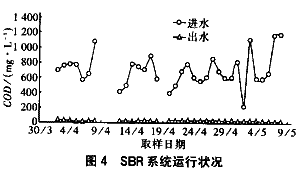 UASB正常運行后,厭氧出水和鍋爐廢水混合后的COD濃度比以前大大降低,但水質波動仍然很大(COD濃度在400~1 200 mg/L之間)。盡管如此,SBR的出水COD濃度始終保持在20~40 mg/L之間。從實際運行來看,該系統經過改造后,SBR反應池運行更加穩定,出水水質較好。圖4為SBR反應池進、出水COD濃度的變化情況,整個系統監測結果見表4。