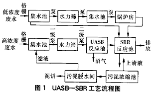 保留原有的SBR工藝,將水解/酸化反應池改造成UASB反應池的過程中,同時實行清污分流,將冷卻水直接排放,高濃度廢水先經過UASB池處理,出水再與低濃度廢水混合進入SBR反應池。整個工藝流程如圖1所示。