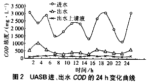 由于廠區占地有限,UASB之前未設調節池,進水COD濃度、pH值一天之內波動很大。在較強的沖擊負荷下,UASB出水有時帶出一些絮狀污泥,使其COD增高,在一定程度上影響了出水水質,但從總的運行來看,UASB具有較強的抗廢水沖擊能力,處理效果穩定,出水COD(混合液)一般在500 mg/L左右,pH在7左右。2001年6月6日對UASB進行了24 h連續監測,所測數據包括進、出水COD濃度、pH值,其中出水COD分別測混合液和上清液兩種水樣。圖2、3分別為UASB進、出水COD和pH值的24 h變化曲線。