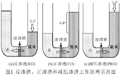 Lee 等(1981)[1]較早地概況總結(jié)了反滲透(RO)、正滲透(FO)和減壓滲透((Pressure Retarded Osmosis,PRO)過(guò)程的工作原理,如圖1 所示。在RO 過(guò)程中,水在外加壓力作用下從低化學(xué)勢(shì)側(cè)通過(guò)滲透膜擴(kuò)散至高化學(xué)勢(shì)側(cè)溶液中( Δπ<ΔP),達(dá)到脫鹽目的。正滲透過(guò)程剛好相反,水在滲透壓作用下從化學(xué)勢(shì)高的一側(cè)自發(fā)擴(kuò)散到化學(xué)勢(shì)低的一側(cè)溶液。而減壓滲透可認(rèn)為是反滲透和正滲透的中間過(guò)程,水壓作用于滲透壓梯度的反方向,水的凈通量仍然是向濃縮液方向。這三個(gè)過(guò)程可以用下式來(lái)描述:Jw=A(σΔπ-ΔP);式中Jw—水通量;A—膜的水滲透性常數(shù);σ—反擴(kuò)散系數(shù);Δπ—膜兩側(cè)的滲透壓差;ΔP—膜兩側(cè)的壓力差。